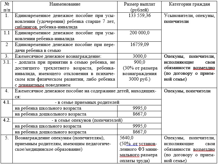 Во многом успешному устройству детей-сирот в семьи способствует организация предоставления дополнительных мер поддержки для данных категорий граждан. Денежные выплаты, пособия и иные меры социальной поддержки представлены в таблице 1.