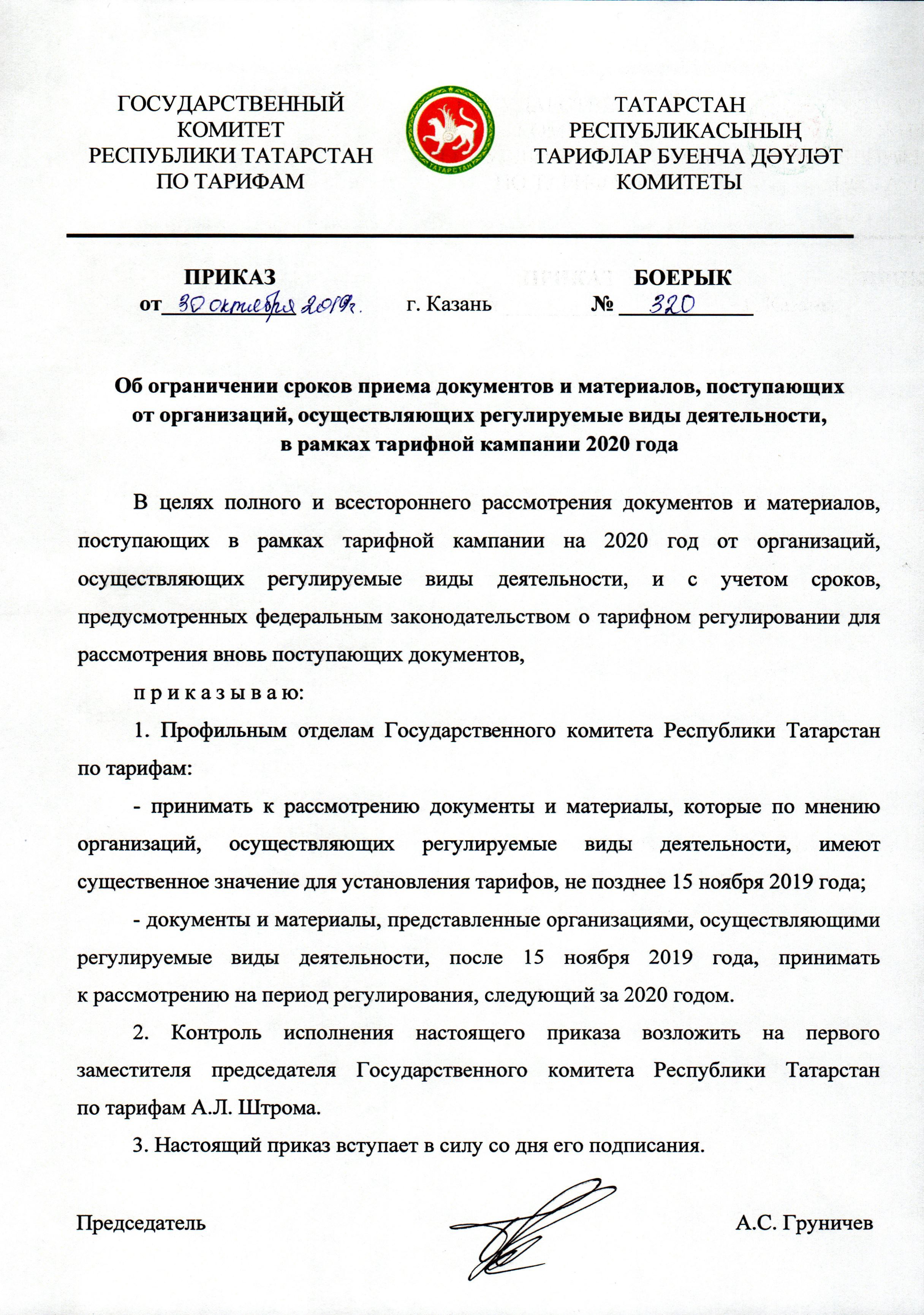 Об ограничении сроков приема документов и материалов, поступающих от организаций, осуществляющих регулируемые виды деятельности, в рамках тарифной компании 2020 года.
