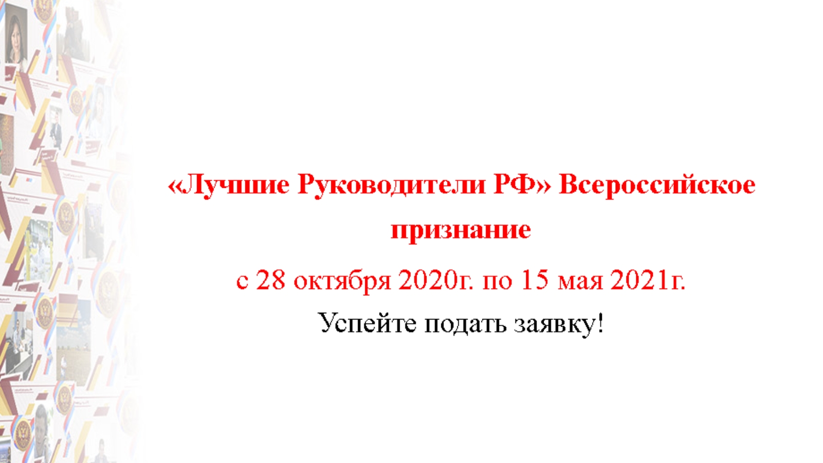 Приём заявок осуществляется через электронные сервисы федеральной выставочной площадки: ЛучшиеРуководителн.РФ