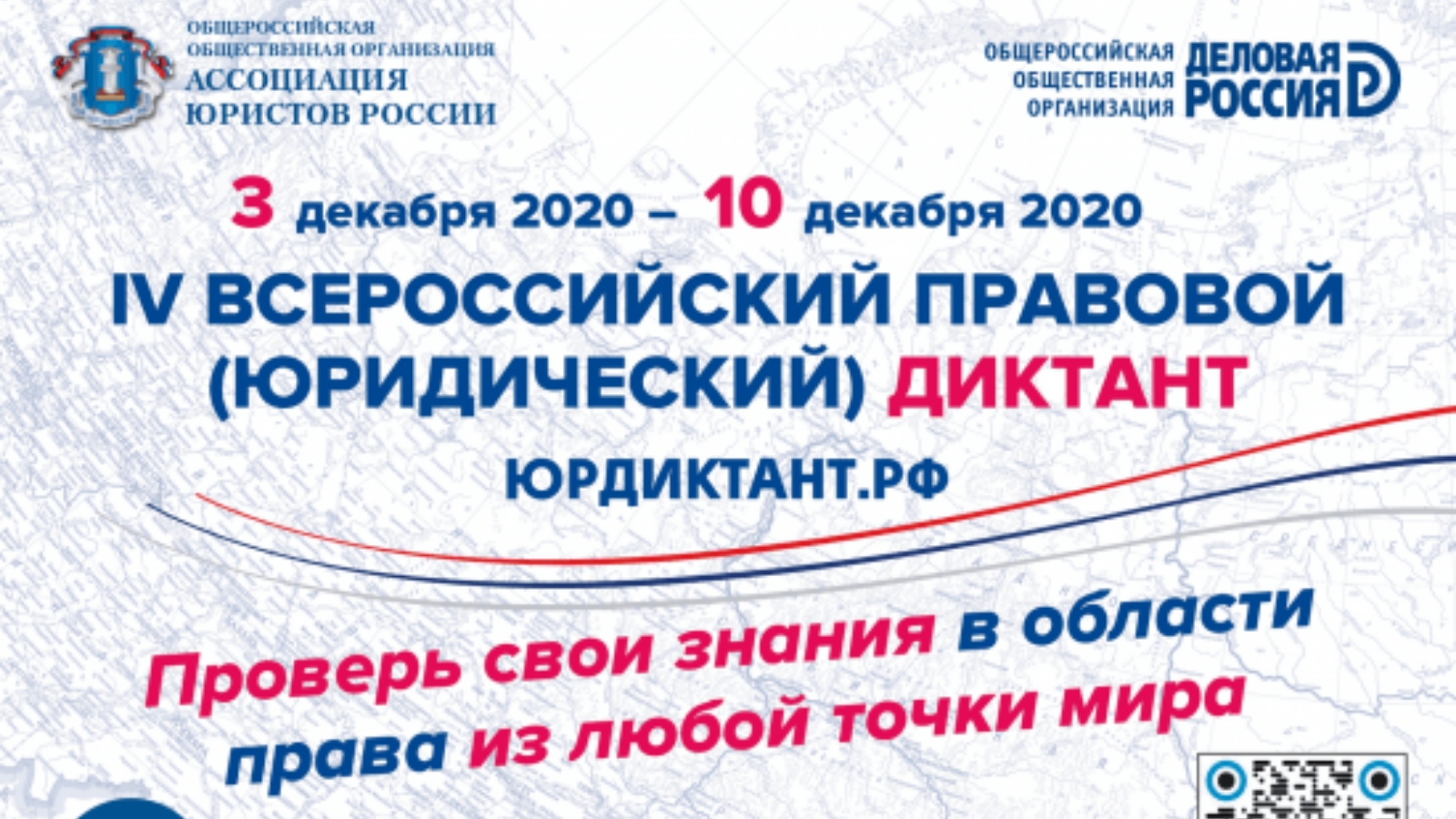 С 3 по 10 декабря 2020 года в целях оценки уровня правовой грамотности населения пройдет Четвертый Всероссийский правовой (юридический)диктант. Соорганизаторами Диктанта выступают Общероссийская общественная организация «Ассоциация юристов России» и Общероссийская общественная организация «Деловая Россия» при поддержке Федерального государственного бюджетного образовательного учреждения высшего образования «Московский государственный юридический университет имени О.Е. Кутафина (МГЮА)». Основные задачи Диктанта – повышение мотивации различных слоев населения к изучению права, получение объективной информации об уровне правовой грамотности населения России с учетом его возрастной и социальной структуры, привлечение средств массовой информации и российского общества к вопросу повышения уровня правовой культуры населения, выработка предложений по совершенствованию образовательных программ. В условиях распространения новой коронавирусной инфекцииCOVID-19 Диктант проводится в режиме онлайн на официальном портале юрдиктант.рф.