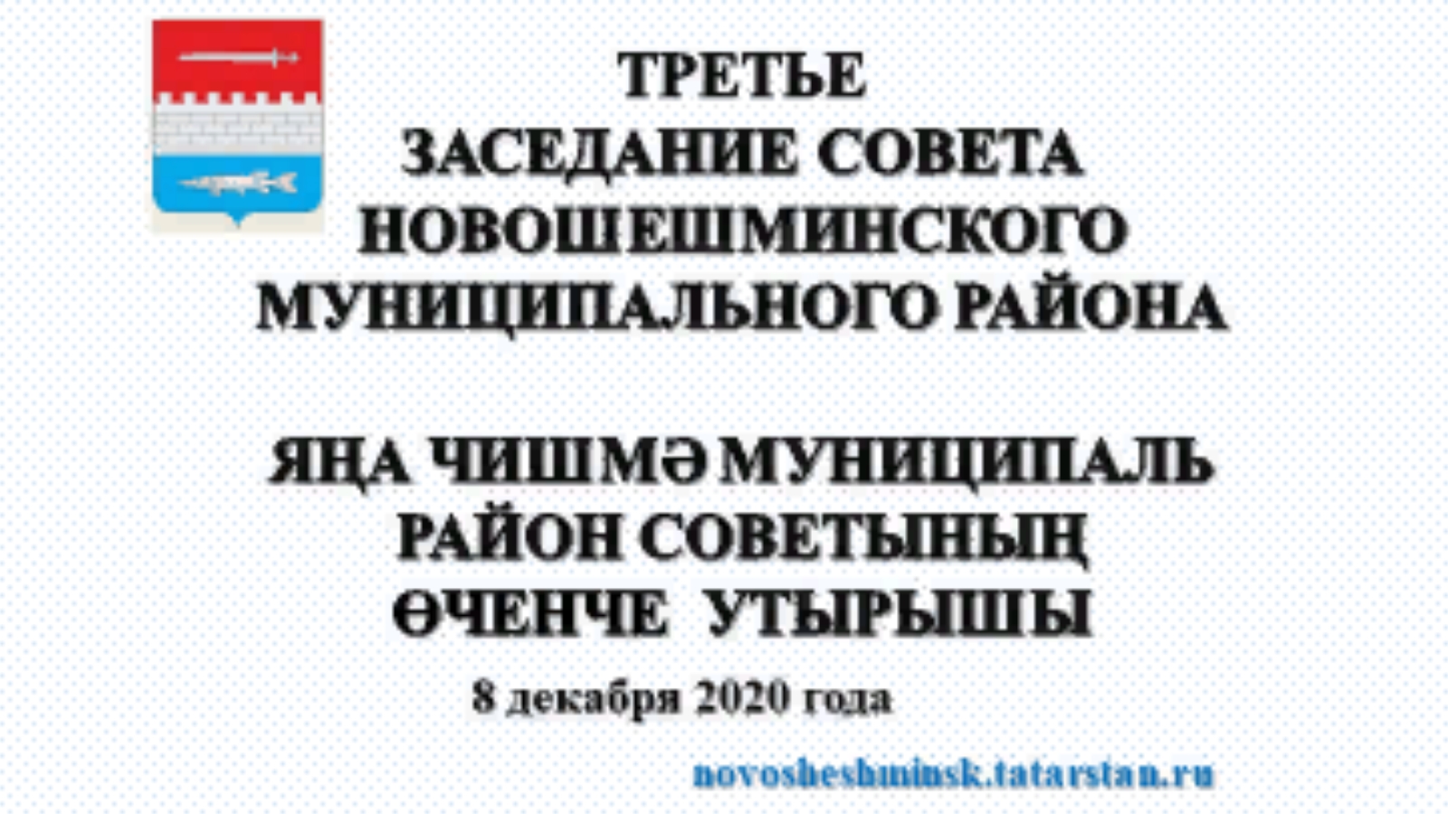 8 декабря 2020 г. в 10.00 часов в большом зале Совета Новошешминского муниципального района по адресу с. Новошешминск, ул. Советская, д. 80 состоится третье заседание Совета Новошешминского муниципального района четвертого созыва. На повестке дня планируется рассмотрение десяти вопросов. Более подробно с повесткой дня можно ознакомиться на официальном сайте Новошешминского муниципального района http://novosheshminsk.tatarstan.ru/rus/proekti-dokumentov.htm в подразделе "Проекты документов", раздел "Документы". Приглашаем депутатов Совета Новошешминского муниципального района Республики Татарстан принять участие в заседании Совета района.