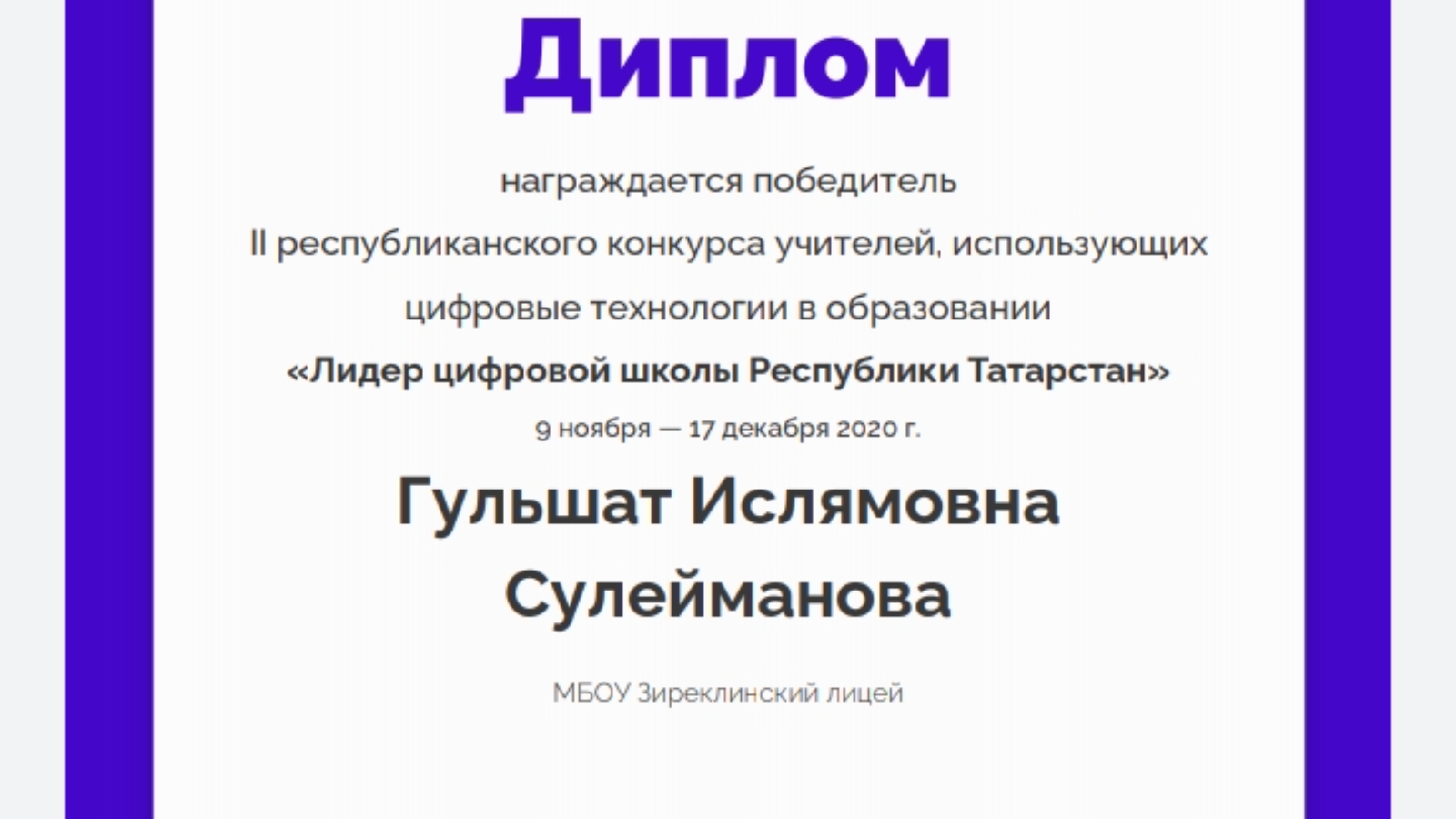 В рамках реализации проекта «Открытая школа 2035» в декабре 2020 года прошел II Республиканский конкурс для учителей «Лидер цифровой школы Республики Татарстан». Конкурс направлен на выявление талантливых педагогов, которые активно используют цифровые инструменты в рамках учебной деятельности, стремятся к развитию ИКТ-компетенций и заинтересованы в освоении новых приемов реализации технологий электронного обучения. Среди учителей начальных классов общеобразовательных школ Новошешминского муниципального района в данном конкурсе приняла участие и стала победителем Сулейманова Гульшат Ислямовна, учитель Зиреклинского лицея. Поздравляем её с победой и желаем дальнейших успехов!