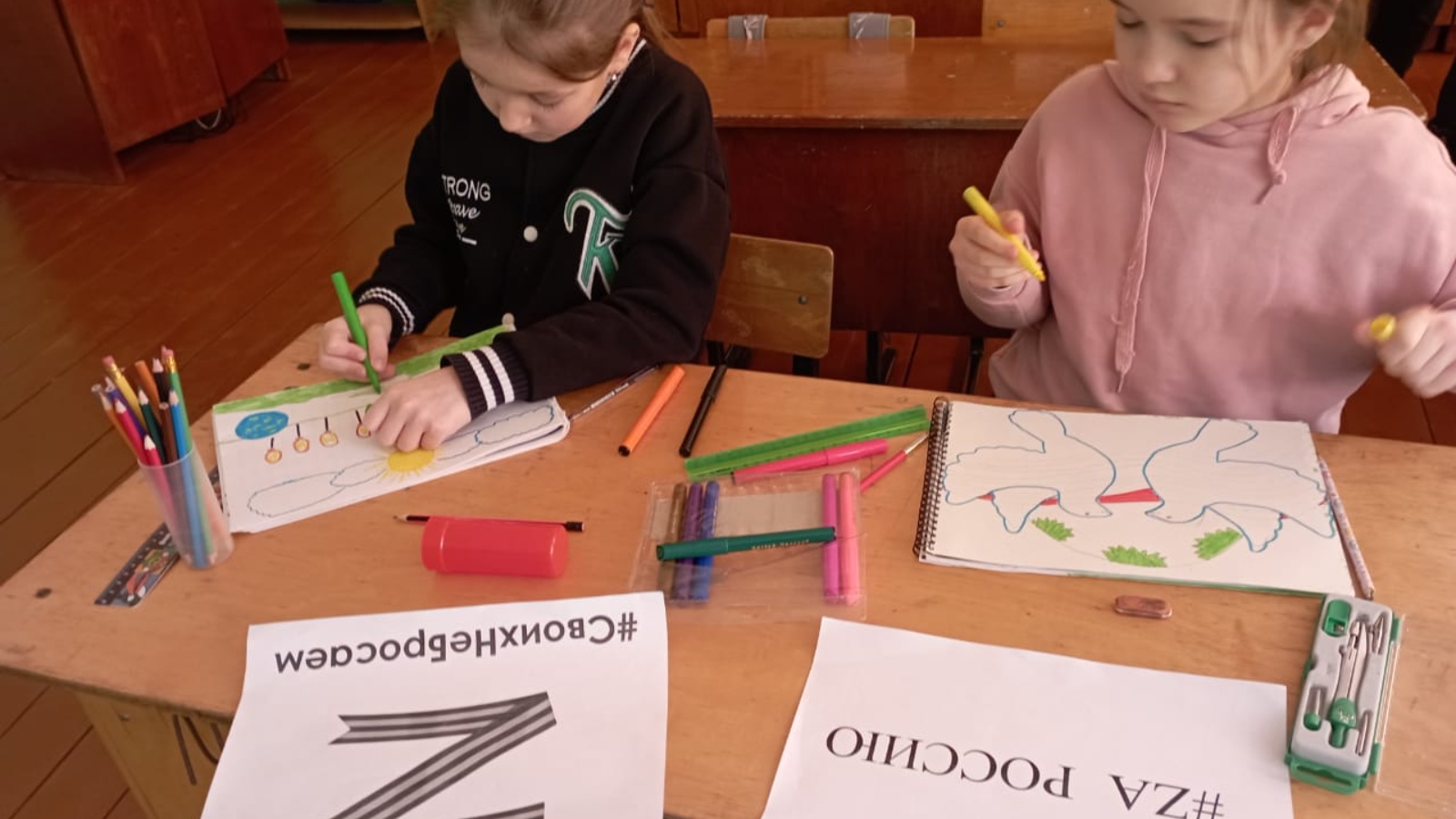 Русские люди едины, поэтому и не проигрывали ни одной войны. Мы дорожим своей историей, каждой ее частицей. Наш народ всегда славился уважением к своей стране, силой, волей и честью постоять за своё государство. Отдать жизнь во имя другой жизни. На рисунках детей был изображен голубь – символ мира, лозунги: «Мы за мир!», «За Россию». Это призыв к тому, чтобы не сдаваться, не опускать руки, верить в лучшее и ждать наших героев с Победой!