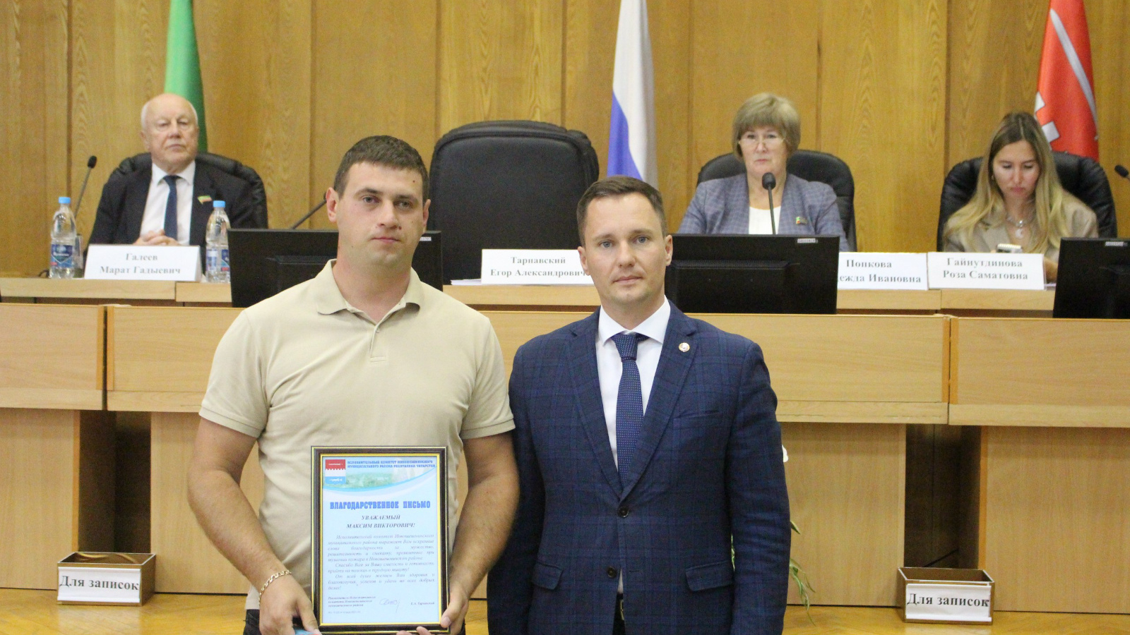 В завершении заседания руководитель исполнительного комитета района Егор Тарнавский под аплодисменты присутствующих выразил глубокую благодарность и вручил Благодарственные письма администрации района и ценные подарки Денису Клюшкину и Максиму Калмыкову.