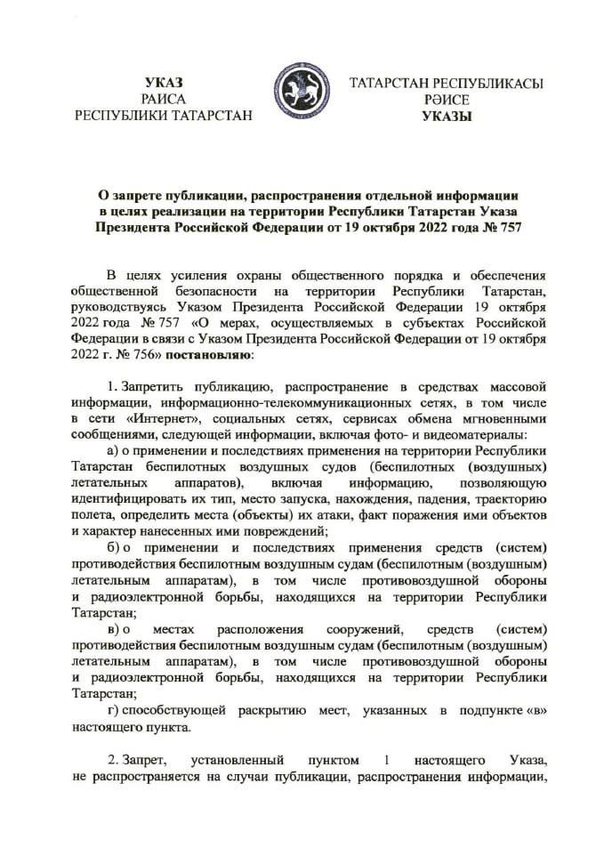 Вышел Указ Раиса Республики Татарстан о запрете распространения в СМИ, сети Интернет, социальных сетях, мессенджерах фото и видео полетов БПЛА, а также возможных последствий их атак.