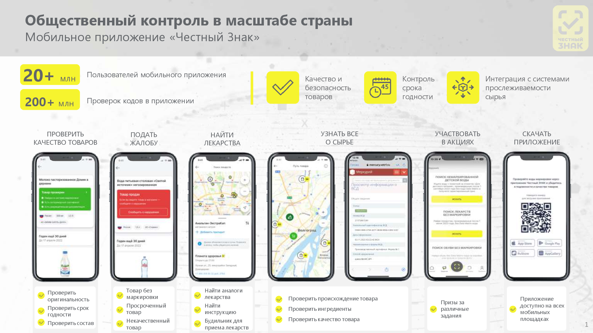 Мобильное приложение «Честный Знак» стало настоящим народным стандартом качества и безопасности товаров. Охват проекта достиг впечатляющей отметки: им активно пользуются более 20 миллионов человек по всей России. Суммарно пользователи провели уже свыше 200 миллионов проверок товаров через сканирование кодов «Честного знака».