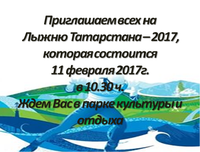 Приглашаем всех желающих на Лыжню Татарстана - 2017, которая сосотоится 11 февраля 2017 г. в 10.30 ч. в парке культуры и отдыха.