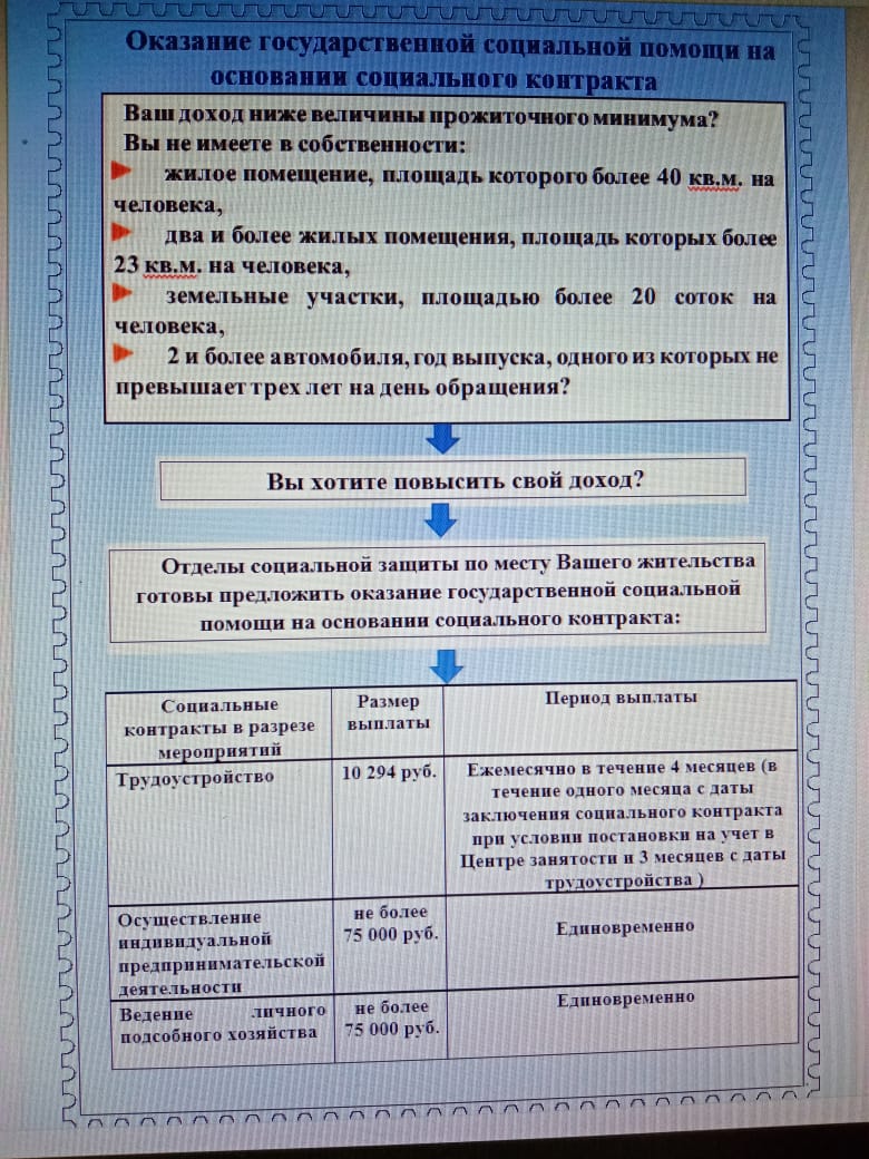 Отделы социальной защиты по месту Вашего жительства готовы предложить оказание государственной социальной помощи на основании социального контракта:
