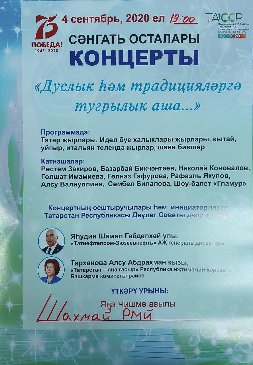 4 сентябрь көнне 19.00 сәгатьтә Яңа Чишмә районының Шахмай авыл мәдәният йортында «Без дус һәм традицияләргә тугрылык белән көчле»дип исемләнгән сәнгать осталары концерты була. Махсус сезнең өчен программада татар, Кытай, Уйгур, итальян телләрендә җырлар яңгыраячак, Идел буе халыкларының җырлары яңгыраячак, шулай ук Сезне күңелле биюләр көтә.