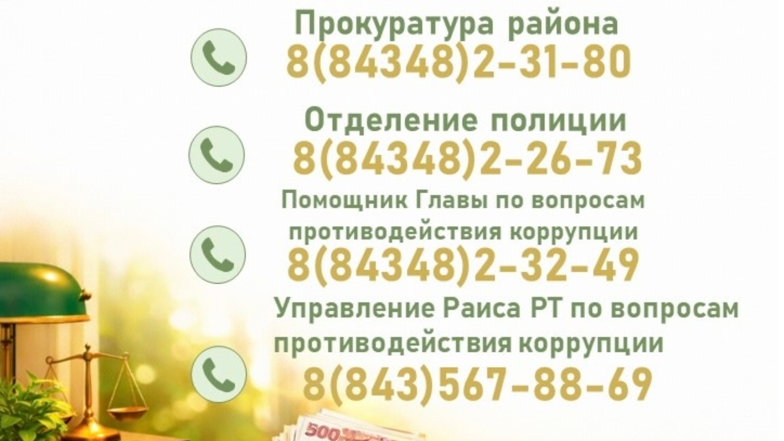 Нов Яңа Чишмәлеләр, әгәр сездән ришвәт сорыйлар яки тәкъдим итәләр икән, «кайнар линия»телефоннары буенча мөрәҗәгать итә аласыз.