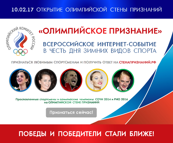 2017 нче елда кышкы спорт төрләре көнен бәйрәм итү кысаларында, олимпиа чемпионнарына үзегезнең чын күңелдән булган теләкләрегезне белдереп, мөрәҗәгать итү өчен Рәсәйкүләм “Олимпиячеләрне тану», интернет-кампаниясенә керә аласыз. Моңа керү бик җайлы: СТЕНАПРИЗНАНИЙ.РФ сайтына кереп, яраткан спортчыңны табып, аңа фикерләреңне, теләкләреңне яза ааласың.Публикациядән соң җавап көтәргә кирәк , теләгең булса соцсеть битләрендә аралашырга мөмкин. .